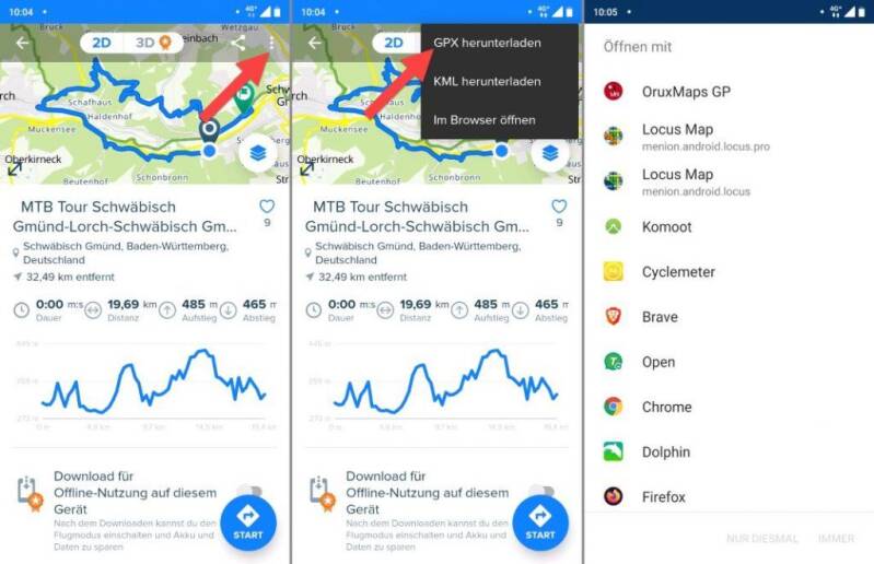 Op een Android smartphone met Chrome browser kan je de GPX meteen openen. Druk na het openen rechts bovenaan op de 3 puntjes en klik op 'openen met'. Kies daarna de eerder gedownloade fietsapp om de GPX te openen.